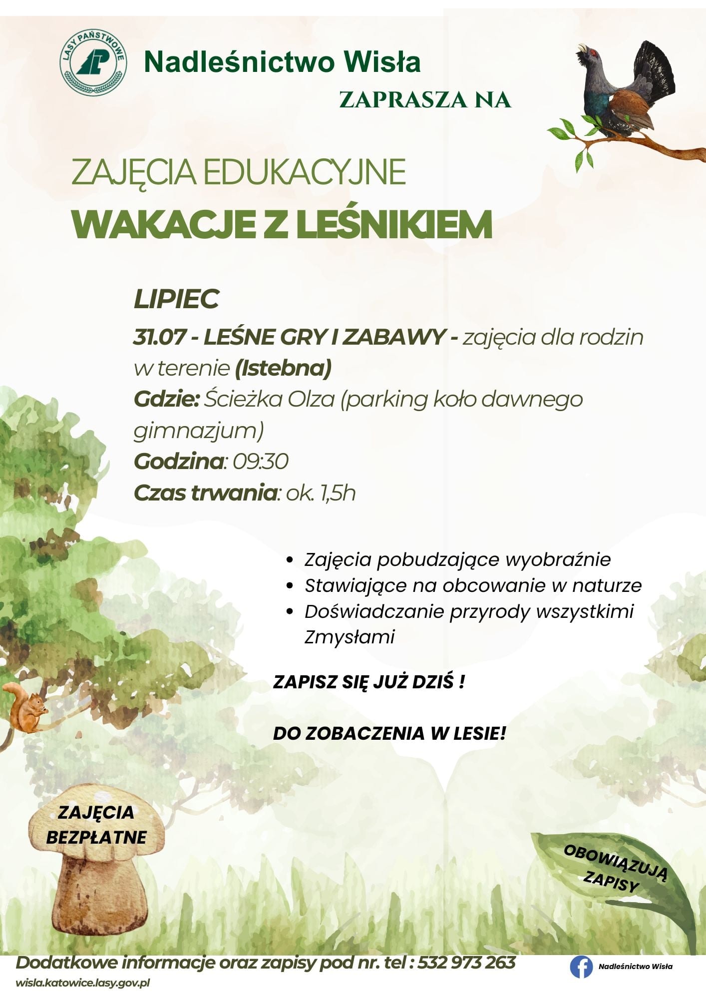 Nadleśnictwo Wisła zaprasza na zajęcia dla rodzin w terenie pt. Leśne Gry i Zabawy, które odbędą się 31 lipca 2025 r.