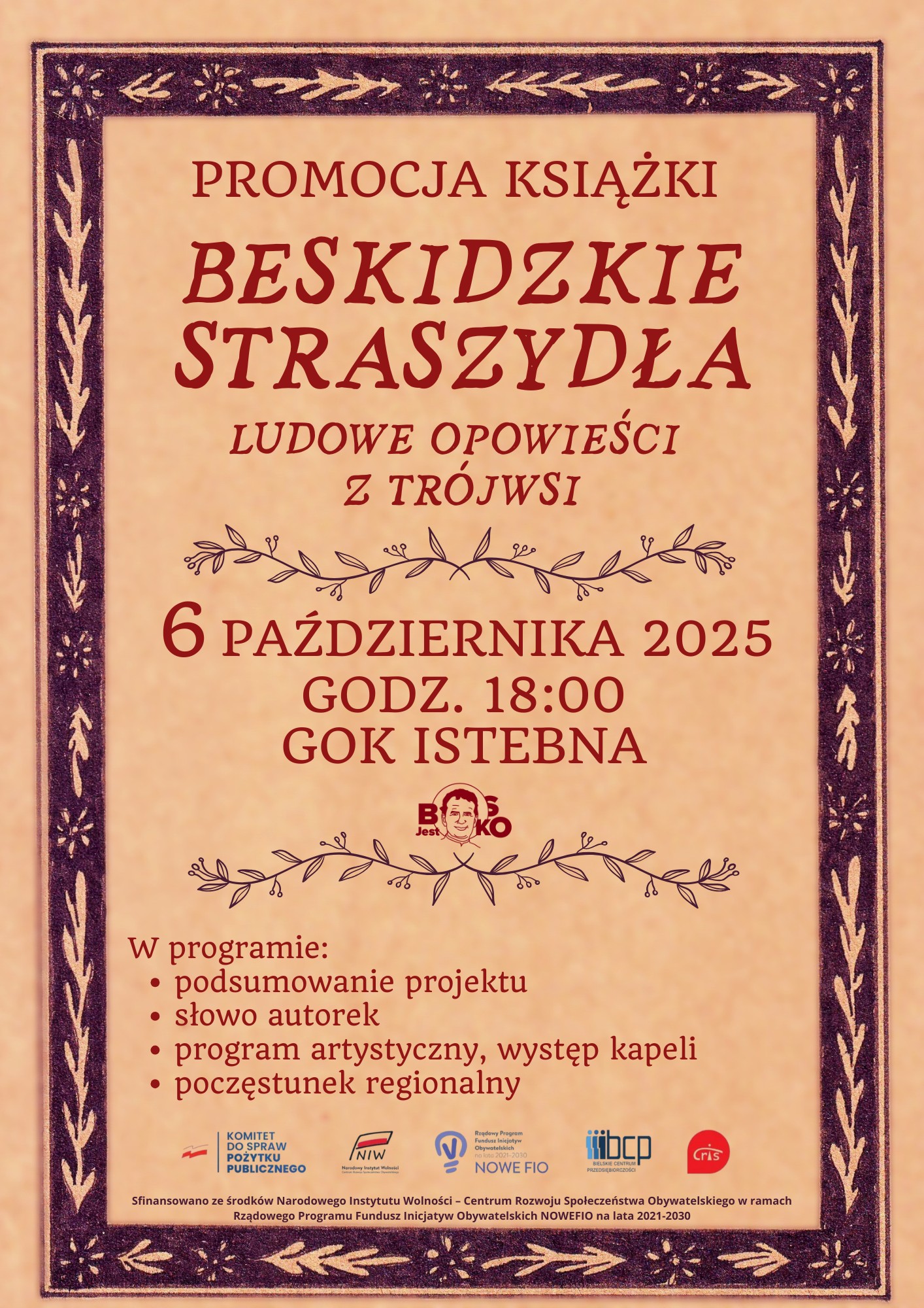 Projekt: "Beskidzkie Straszydła – Ludowe Opowieści z Trójwsi" dofinansowany jest ze środków Narodowego Instytutu Wolności - Centrum Rozwoju Społeczeństwa Obywatelskiego , Śląskie NoweFio , Stowarzyszenie Bielskie Centrum Przedsiębiorczości.