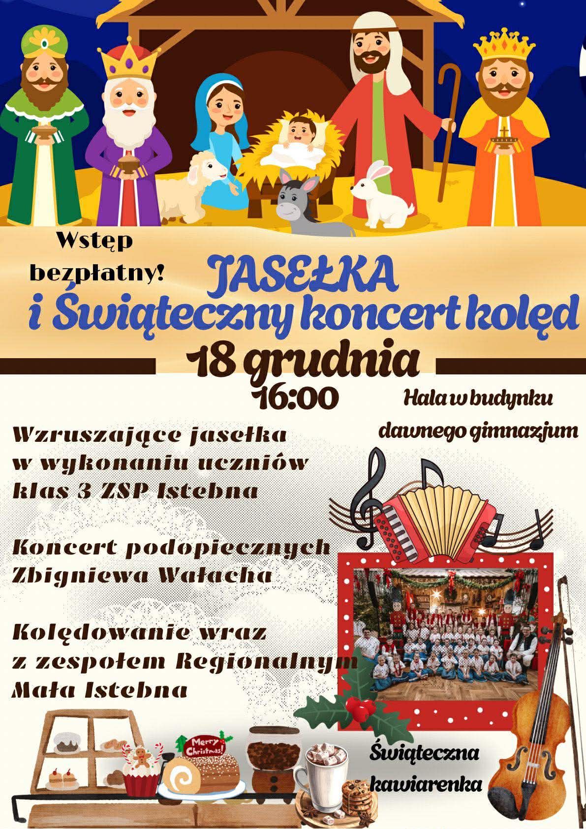 Zespół Szkolno-Przedszkolny serdecznie zaprasza na wzruszające Jasełka w wykonaniu uczniów klas trzecich, a także koncert kolęd w wykonaniu Zespołu Regionalnego "Mała Istebna" oraz uczniów Zbigniewa Wałacha.