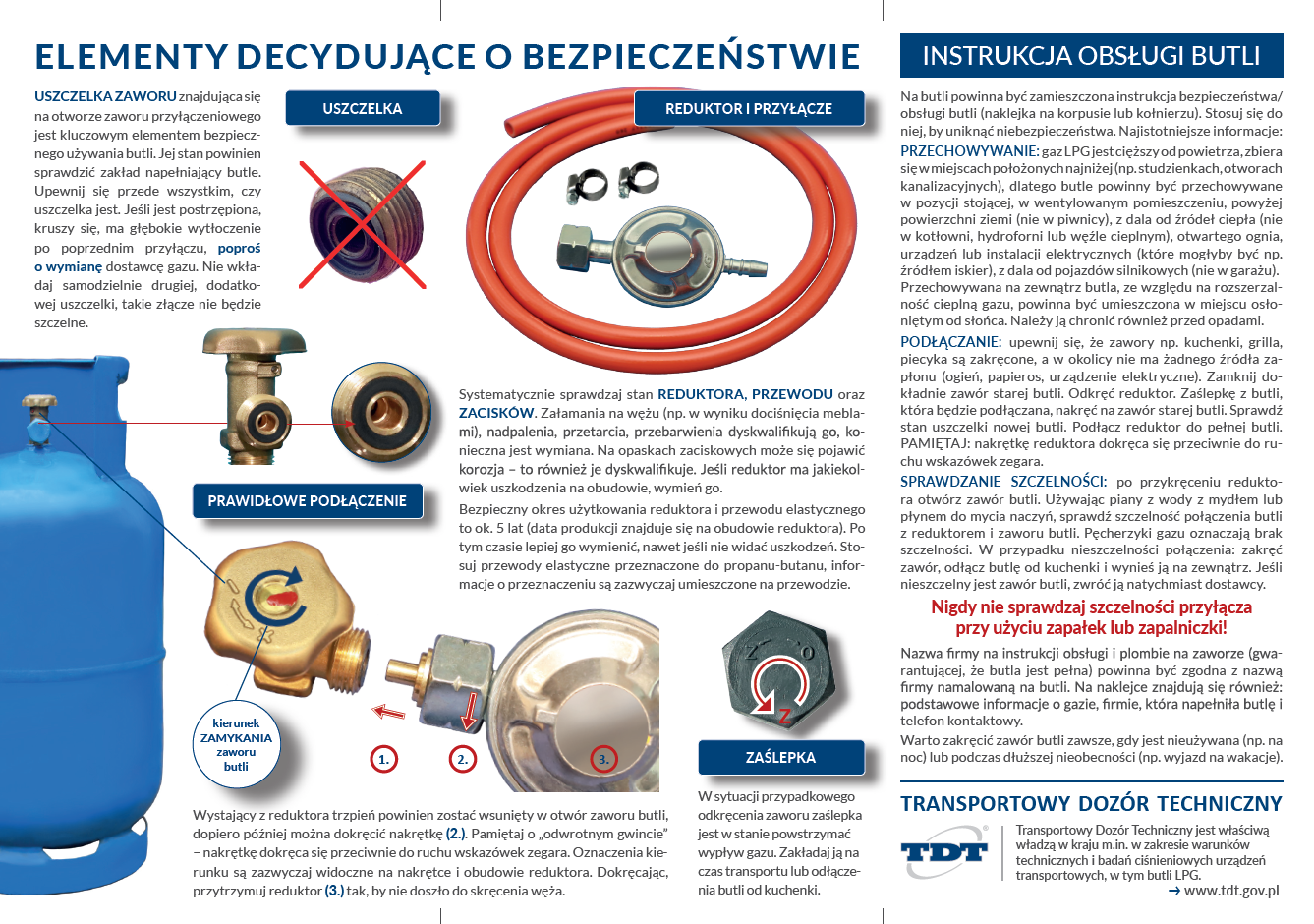 Zapraszamy do zapoznania się z kompendium wiedzy dotyczącym bezpiecznej eksploatacji butli LPG, a także do pobrania materiałów oraz ich udostępniania pod adresem: https://www.tdt.gov.pl/informacje/baza-wiedzy/bezpieczenstwo-butli-na-gaz-lpg/