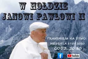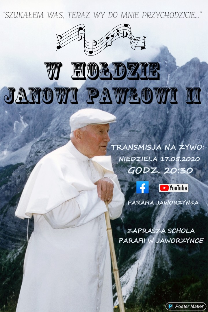 Schola Parafii Świętych Apostołów Piotra i Pawła w Jaworzynce zaprasza do wysłuchania transmisji na żywo koncertu „W hołdzie św. Janowi Pawłowi II” z okazji 100-lecia Jego urodzin. Transmisja on-line na Facebook'u i YouTube. Początek transmisji o godzinie 20.30.
