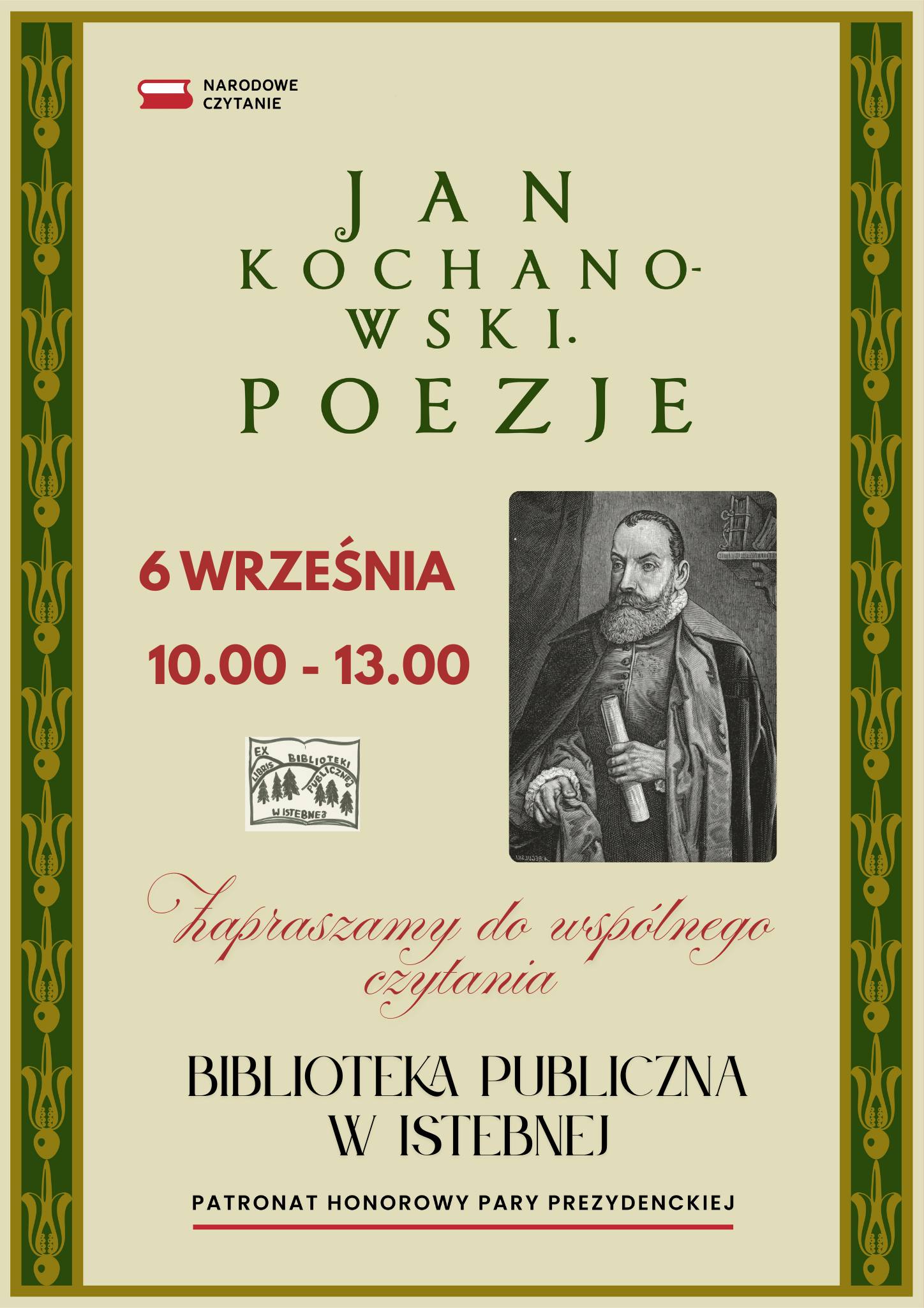 Biblioteka Publiczna w Istebnej zaprasza do wspólnego czytania Poezji Jana Kochanowskiego w ramach tegorocznego Narodowego Czytania.