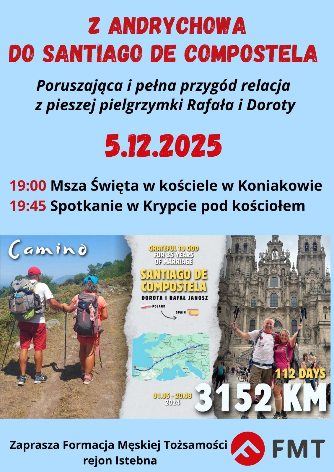 Formacja Męskiej Tożsamości Istebna  zaprasza na poruszającą relację z PIESZEJ pielgrzymki Rafała i Doroty z Andrychowa do Santiago de Compostela. Podzielą się z nami swoimi przygodami oraz doświadczeniem Opatrzności Bożej podczas wędrówki o długości ponad 3 000 km w najbliższy piątek 5 grudnia o godzinie 19:45 w krypcie pod Kościołem św. Bartłomieja Apostoła w Koniakowie.