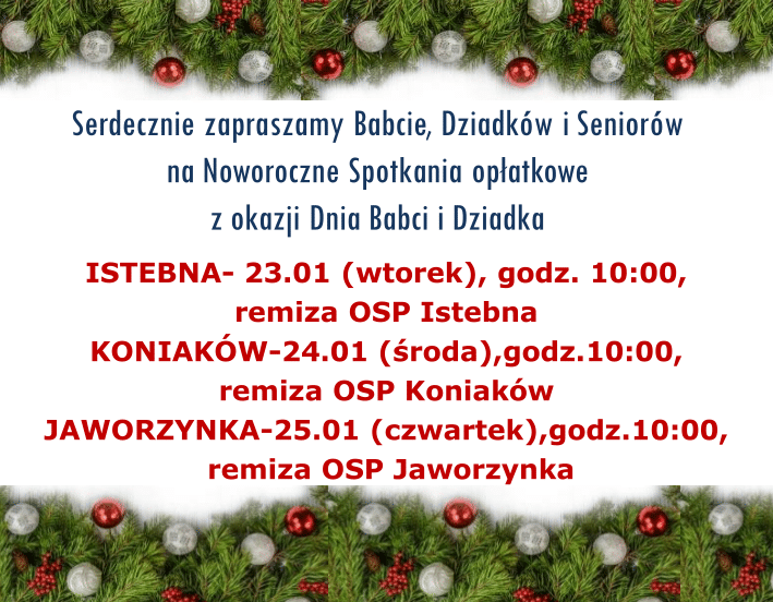 Serdecznie zapraszamy Babcie, Dziadków i Seniorów na Noworoczne Spotkania opłatkowe z okazji Dnia Babci i Dziadka