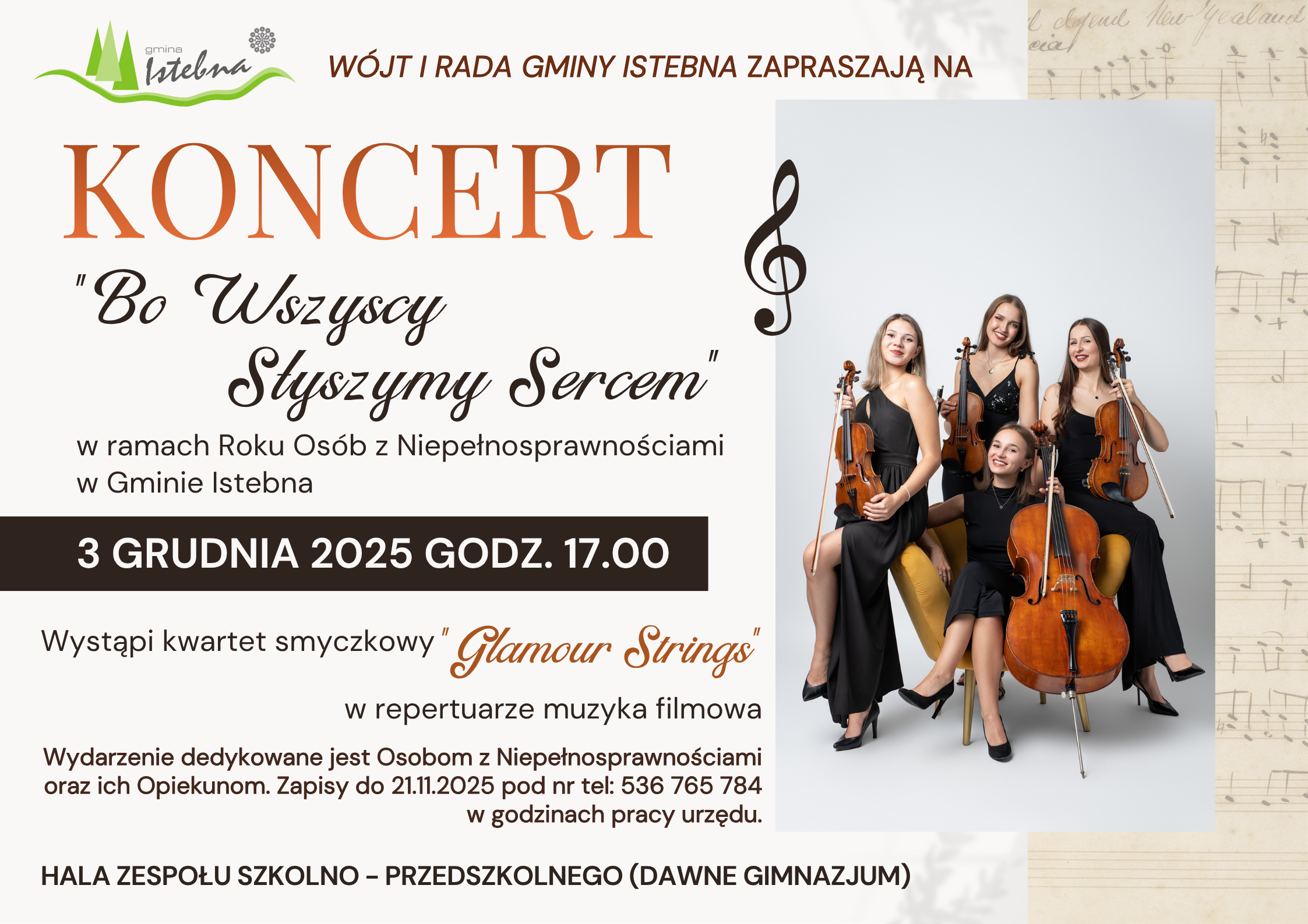 Wójt Gminy Istebna Stanisław Legierski wraz z Radą Gminy Istebna serdecznie zapraszają na Koncert "Bo Wszyscy Słyszymy Sercem", który odbędzie sie dnia 3 grudnia 2025r. o godz.: 17:00 w hali zespołu szkolno-przedszkolnego w Istebnej (dawne gminazjum). Gwiazdą tego wieczoru będzie kwartet smyczkowy "Glamour Strings".