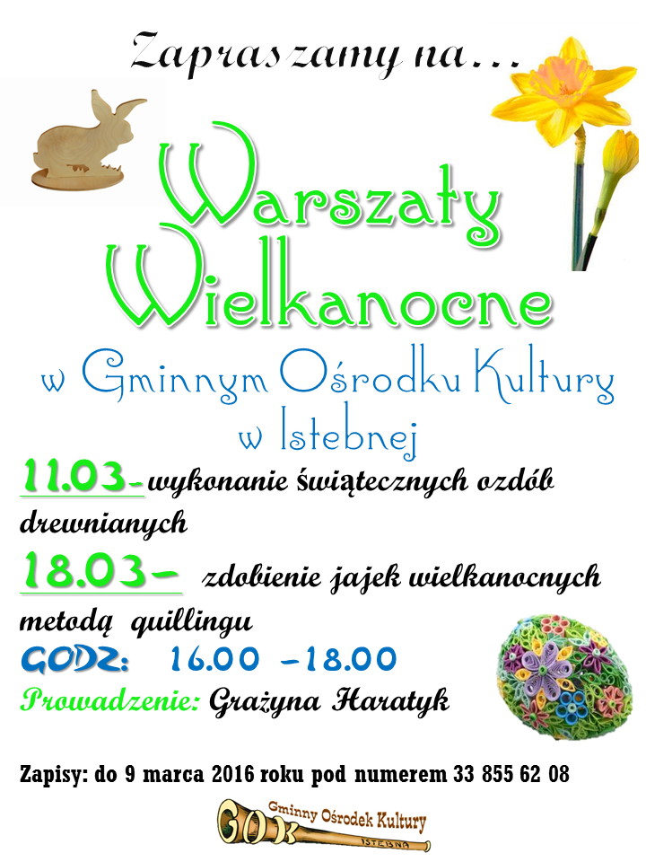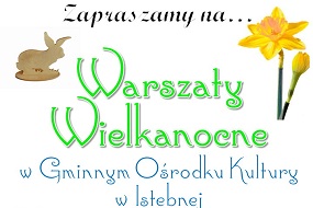 Gminny Ośrodek Kultury, Promocji, Informacji Turystycznej i Biblioteka Publiczna w Istebnej zapraszają na warsztaty zdobienia jajek wielkanocnych metodą quillingu. Warsztaty odbędą się w siedzibie Ośrodka w godzinach 16.00 - 18.00, poprowadzi je pani Grażyna Haratyk. Zapisy do dnia 9 marca pod numerem telefonu 33 855 62 08