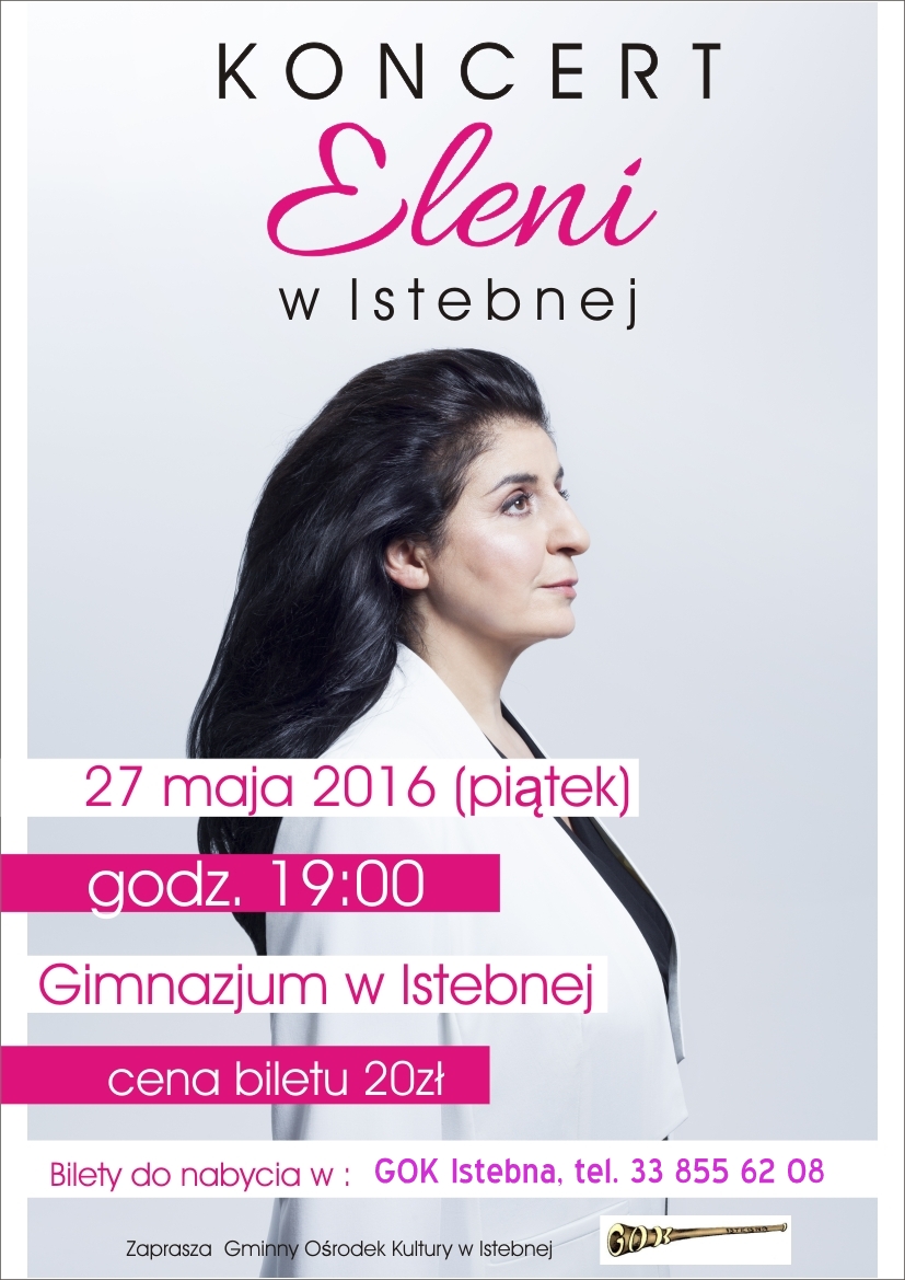 Koncert piosenkarki pochodzenia greckiego. Bilety do nabycia w siedzibie Gminnego Ośrodka Kultury, Promocji, Informacji Turystycznej i Biblioteki Publicznej w Istebnej. Koszt 20 zł. Początek koncertu o godzinie 19.00