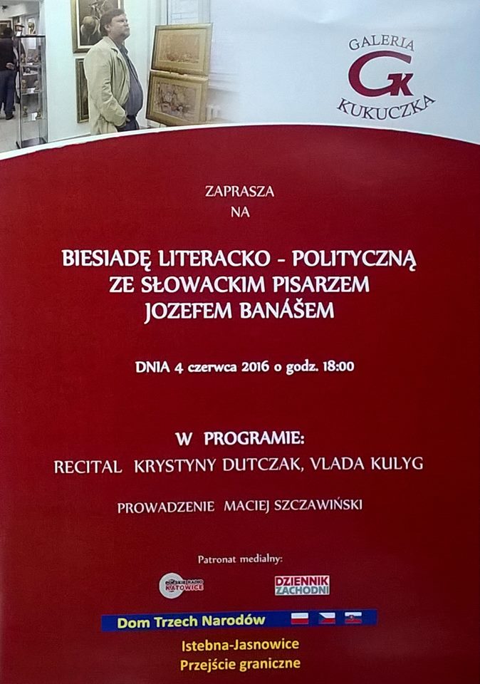 Dnia 4 czerwca o godzinie 18.00 będzie mieć miejsce kolejne, niecodzienne wydarzenie artystyczne. Tym razem spotka się literatura z muzyką. Wybitny słowacki pisarz Jozef Banáš, postać ciesząca się dużą popularnością na słowackim rynku literackim ale i także poza jego granicami opowie o swojej pasji artystycznej. Dzisiaj  znany także jako poseł, polityk,  wiceprzewodniczący Zgromadzenia parlamentarnego NATO - czy te "przygody" stanowiły treść literackich dzieł?  Postać na pewno warta poznania. W Polsce najbardziej znanym dziełem literackim Jozefa Banáša - jest  "Strefa Entuzjazmu" w piękny sposób połaczona historia, dokument z fikcją literacką.