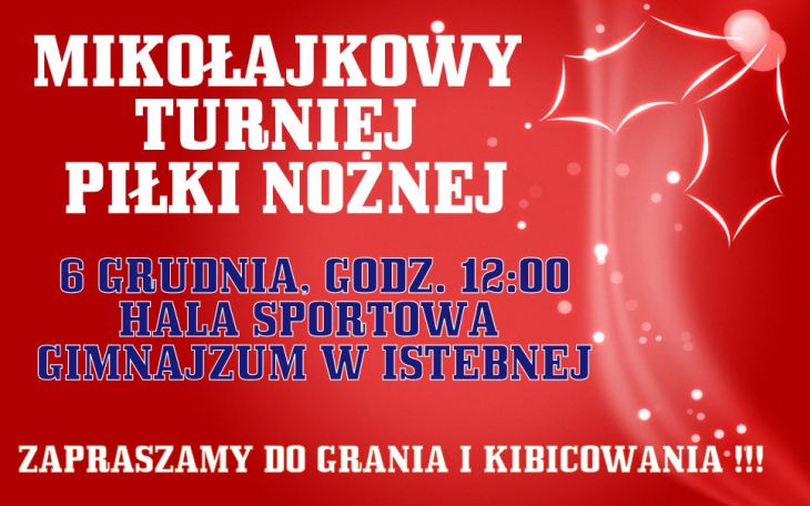 6 grudnia na hali sportowej przy Gimnazjum w Istebnej odbędzie się druga edycja Mikołajkowego Turnieju Piłki Nożnej. Zachęcamy do wzięcia udziału wszystkich miłośników halowych zmagań piłkarskich.