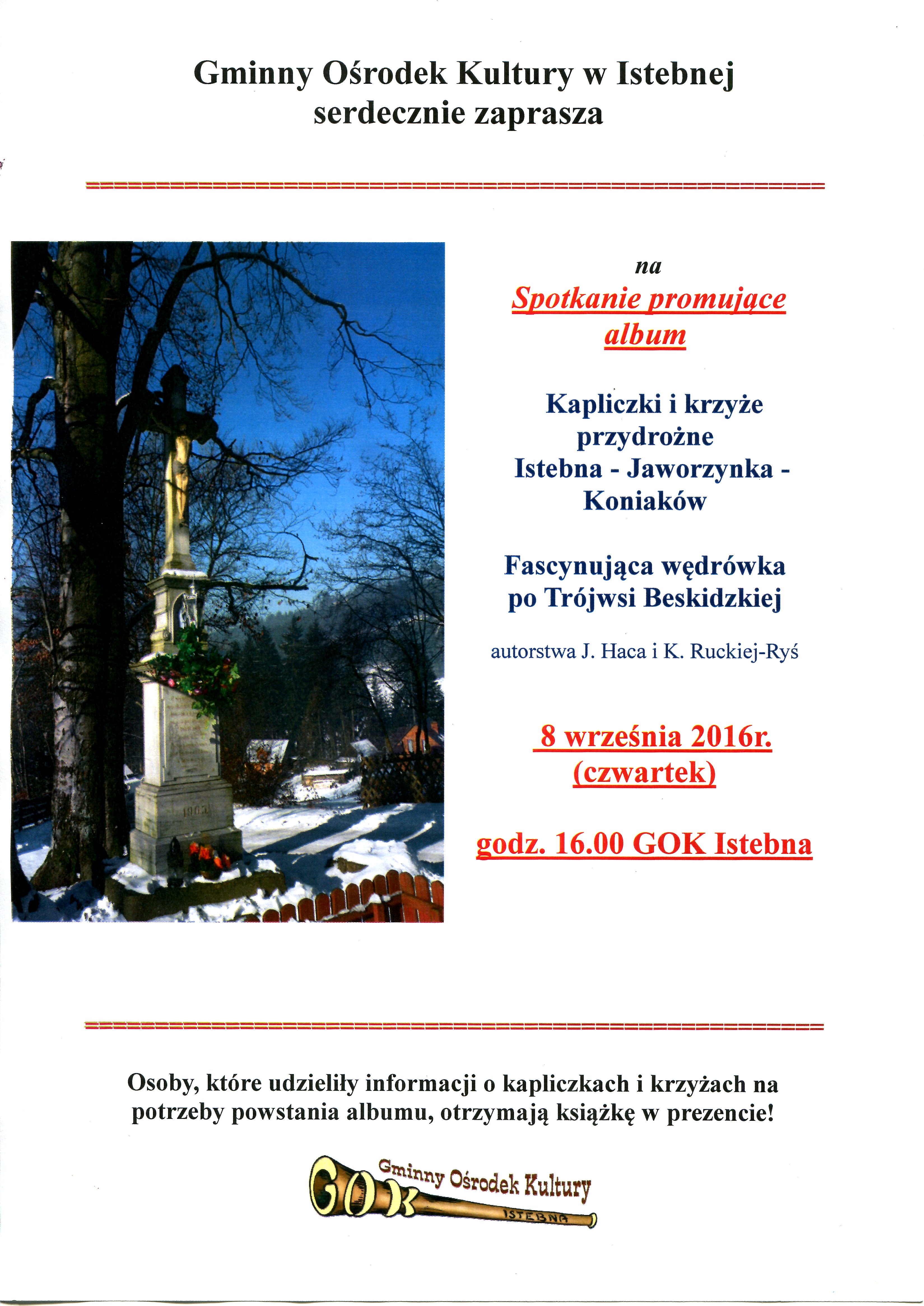 Gminny Ośrodek Kultury, Promocji, Informacji Turystycznej i Biblioteka Publiczna w Istebnej serdecznie zaprasza na spotkanie promujące album "Kapliczki i krzyże przydrożne Istebna - Jaworzynka - Koniaków; Fascynująca wędrówka po Trójwsi Beskidzkiej" autorstwa Jerzego Haca i Katarzyny Ruckiej-Ryś