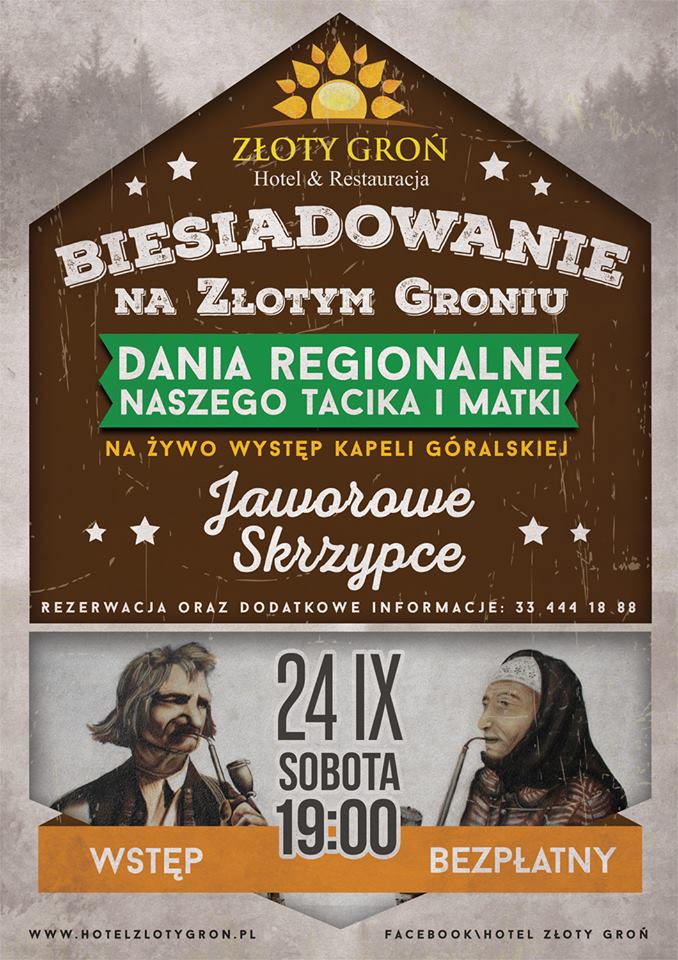 Już w sobotę 24 września od godz. 19:00 zapraszamy na prawdziwe biesiadowanie przy muzyce na żywo w wykonaniu kapeli góralskiej Jaworowe Skrzypce. Specjalnie na tą okazję przygotujemy dania regionalne naszego Tacika i Matki.