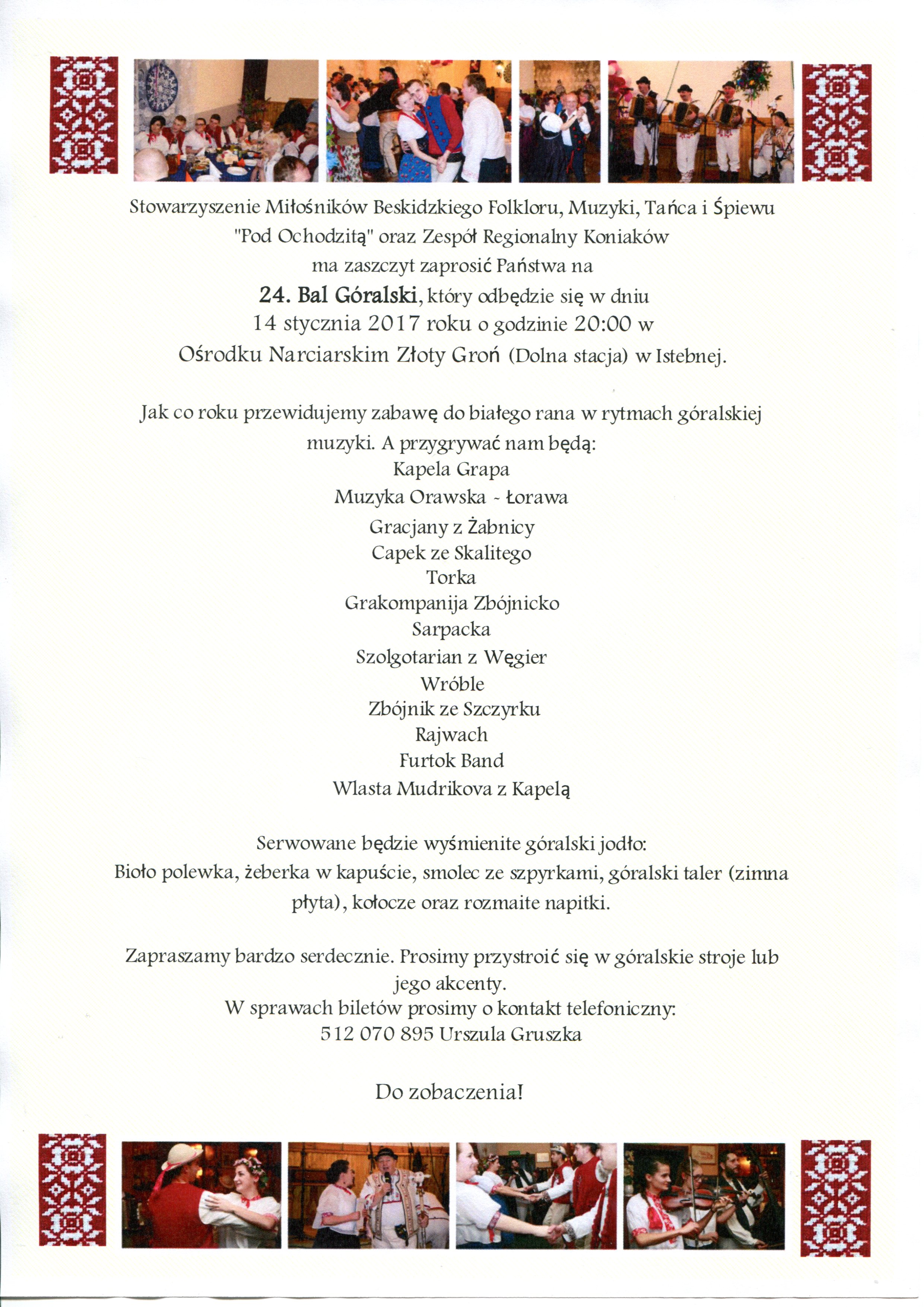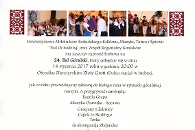 Uś teraz Was wśeckich pieknie pytomy na XXIV Bal Górolski, kiery łodbeje sie 14 stycznia 2017 roku.