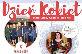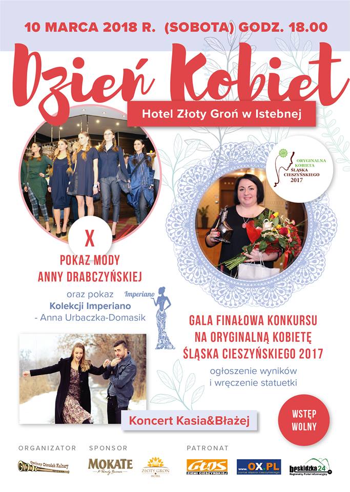 Z okazji Dnia Kobiet zapraszamy serdecznie wszystkie Panie do Hotelu & Restauracji Złoty Groń, gdzie 10 marca o godzinie 18.00 odbędzie się uroczysta gala finałowa konkursu na Oryginalną Kobietę Śląska Cieszyńskiego 2017 oraz X Pokaz Mody Anny Drabczyńskiej, a także pokaz Kolekcji Imperiano. W programie także koncert w wykonaniu zespołu KASIA & BŁAŻEJ.