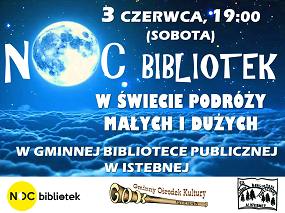 Gminna Biblioteka Publiczna w Istebnej serdecznie zaprasza na trzecią już edycję Nocy Bibliotek. Tym razem tematem przewodnim nocnego spotkania będą podróże – zarówno te dalekie, jak i całkiem bliskie. Bez względu na to, czy masz na swoim koncie zamorskie wyprawy, czy może fascynuje Cię poznawanie i dokumentowanie piękna najbliższej okolicy -  przyjdź, jeśli tylko chcesz podzielić się swymi doświadczeniami i pasją! Książki, czasopisma, filmy, fotografia, a przede wszystkim dyskusja o życiu w drodze i poznawaniu świata. Wydarzenie to skierowane jest również do tych, którzy być może nie przemierzyli jeszcze globu wzdłuż i wszerz, ale chcieliby dowiedzieć się, jak zaplanować podróż, na co zwrócić uwagę, jak ją ciekawie dokumentować, albo też zwyczajnie szukają pomysłu na niezapomniane wakacje :-)
