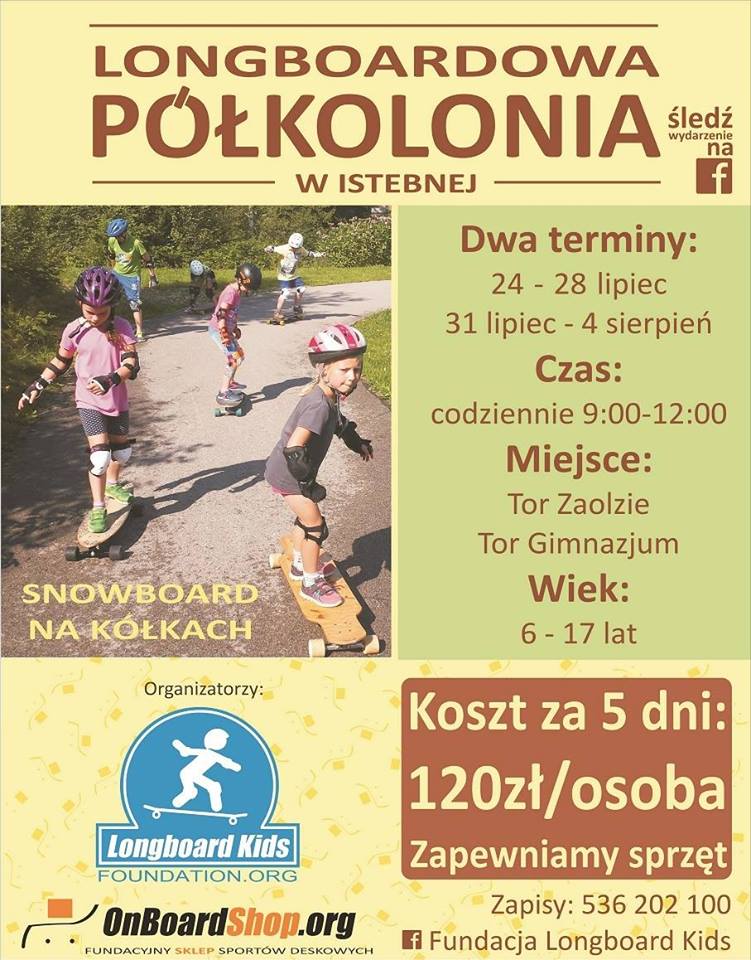 Longboardowe Półkolonie w Istebnej odbywać będą się na dwóch malowniczo położonych torach na Zaolziu, a więc tam, gdzie już od wiosny w każdą środę  spotykają się miłośnicy longboardów, oraz przy miejscowym gimnazjum. Codzienne zajęcia zapewnią uczestnikom ruch na świeżym powietrzu, dawkę pozytywnej energii oraz oczywiście nabycie nowych umiejętności. Z półkolonii mogą skorzystać zarówno osoby jeżdżące jak i te, które nigdy nie miały okazji jeździć. Umiejętność jazdy i uśmiech po całym tygodniu gwarantowane :-) Organizator zapewnia uczestnikom sprzęt oraz pomoc w ewentualnym poszukiwaniu noclegu. Koszt uczestnictwa w półkolonii to 120 zł od osoby, zajęcia będą się odbywać w godzinach od 9.00 do 12.00. Półkolonie przeznaczone są dla dzieci i młodzieży począwszy od szóstego roku życia.