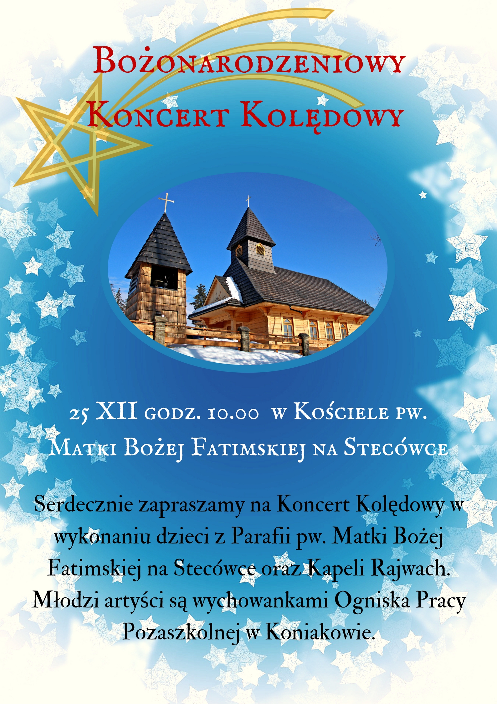 Serdecznie zapraszamy na Bożonarodzeniowy Koncert Kolędowy w wykonaniu dzieci z Parafii pw. Matki Bożej Fatimskiej na Stecówce oraz Kapeli Rajwach.