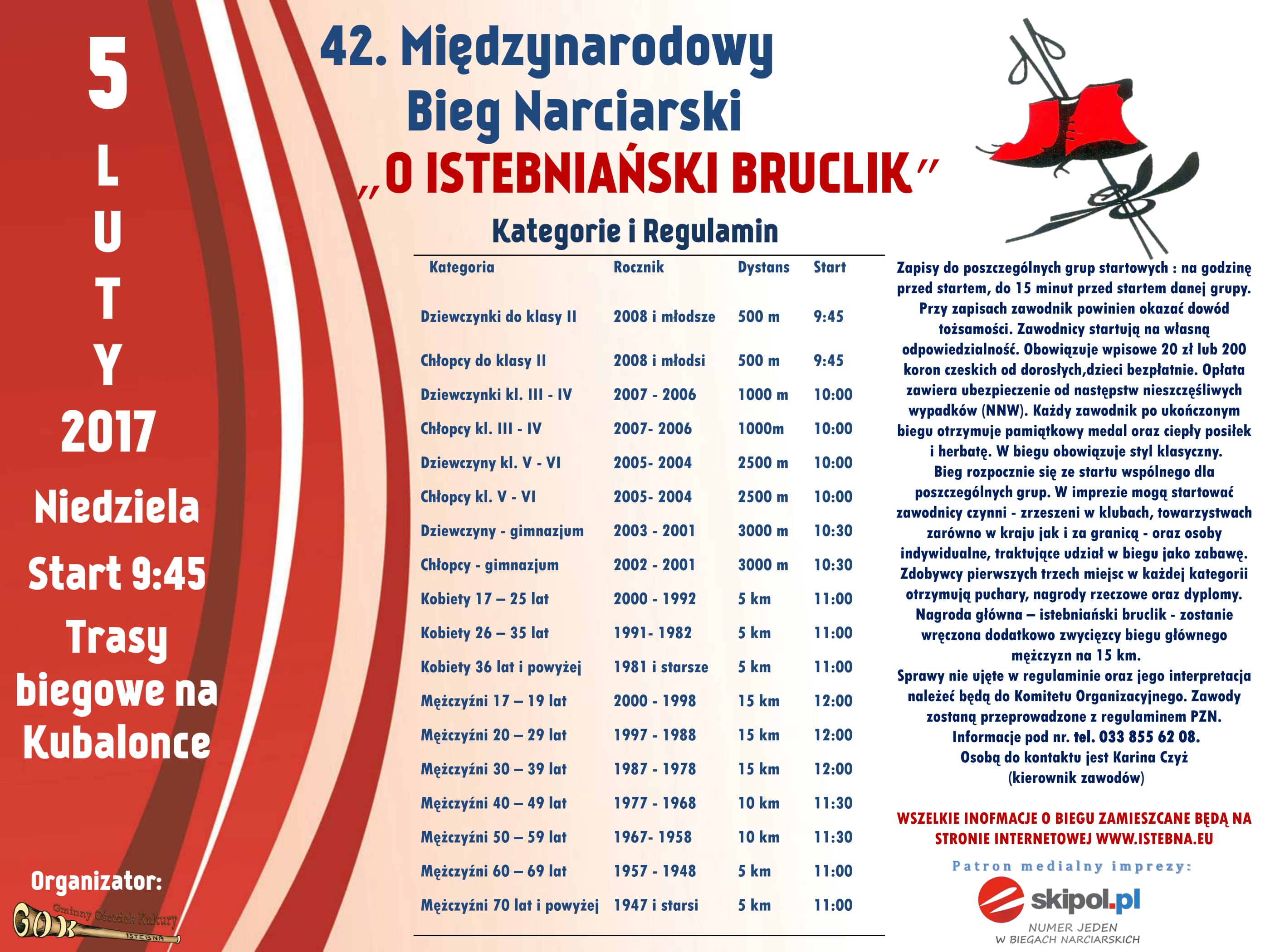 42. Międzynarodowy Bieg Narciarski "O Istebniański Bruclik" odbędzie się w niedzielę 5 lutego na Kubalonce, gdzie rywalizować będą miłośnicy, pasjonaci, amatorzy i zawodnicy w kategoriach od juniora po seniora.