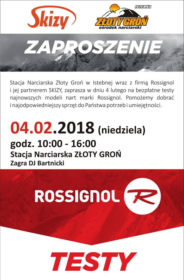Stacja Narciarska Złoty Groń w Istebnej wraz z firmą Rossignol i jej partnerem Skizy, zaprasza w dniu 4 lutego na bezpłatne testy najnowszych modeli nart marki Rossignol. Pomożemy dobrać najodpowiedniejszy sprzęt do Państwa potrzeb i umiejętności.