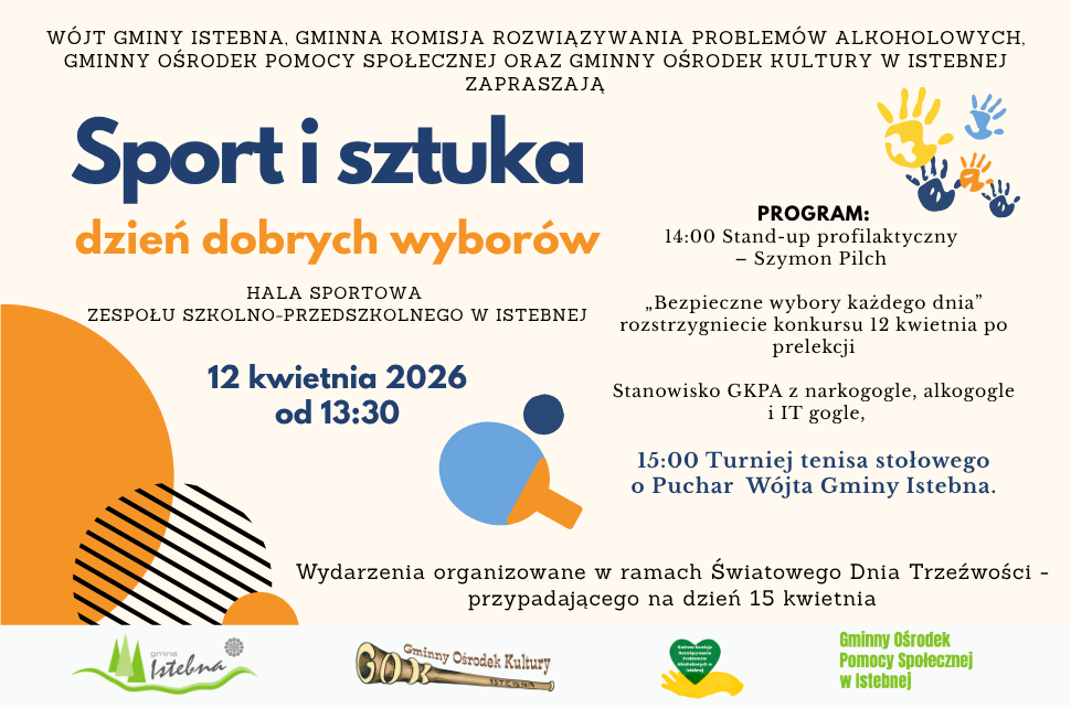 Sport i sztuka - dzień dobrych wyborów w Istebnej, pod takim hasłem spotykamy się już 12 kwietnia. Serdecznie zapraszamy mieszkańców do udziału w wydarzeniu profilaktyczno-edukacyjnym.
