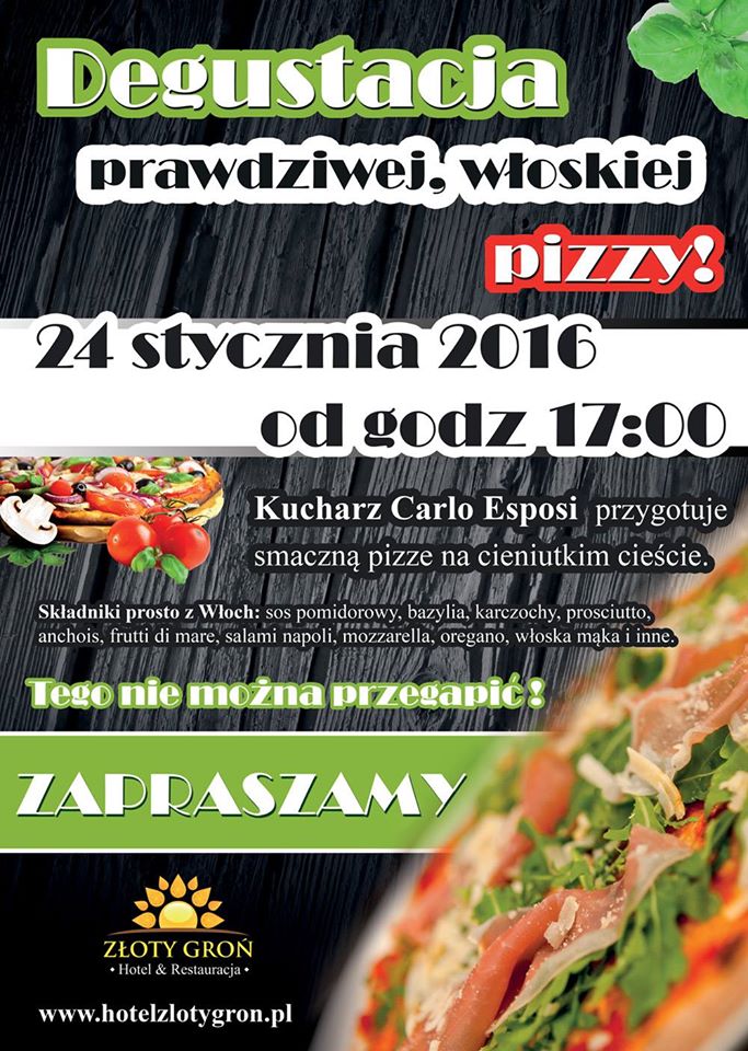 24 stycznia 2016 roku Restauracja Hotelu Złoty Groń zaprasza od godziny 17:00 na degustację najprawdziwszej włoskiej pizzy.