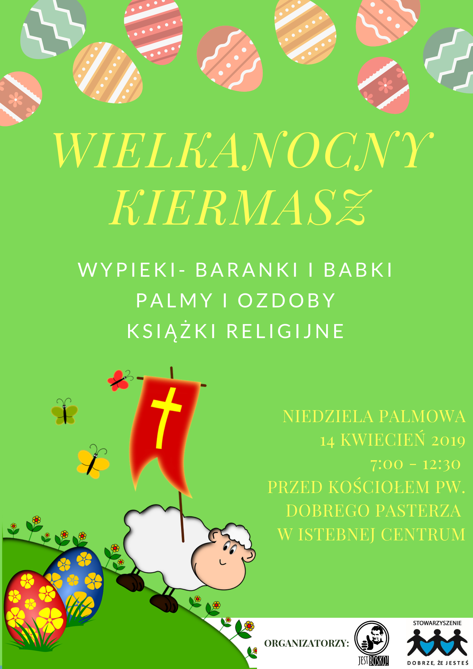 Fundacja "Jest BOSKO" oraz Stowarzyszenie "Dobrze, że Jesteś" Istebna serdecznie zapraszają na tegoroczny Kiermasz Wielkanocny, jaki odbędzie się w Niedzielę Palmową na placu przed Kościołem pw. Dobrego Pasterza w Istebnej Centrum po wszystkich dopołudniowych Mszach Świetych. Dochód uzyskany ze sprzedaży świątecznych smakołyków, ozdób, książek religijnych oraz tradycyjnych palm przezanczony zostanie na działalność statutową fundacji i stowarzyszenia.