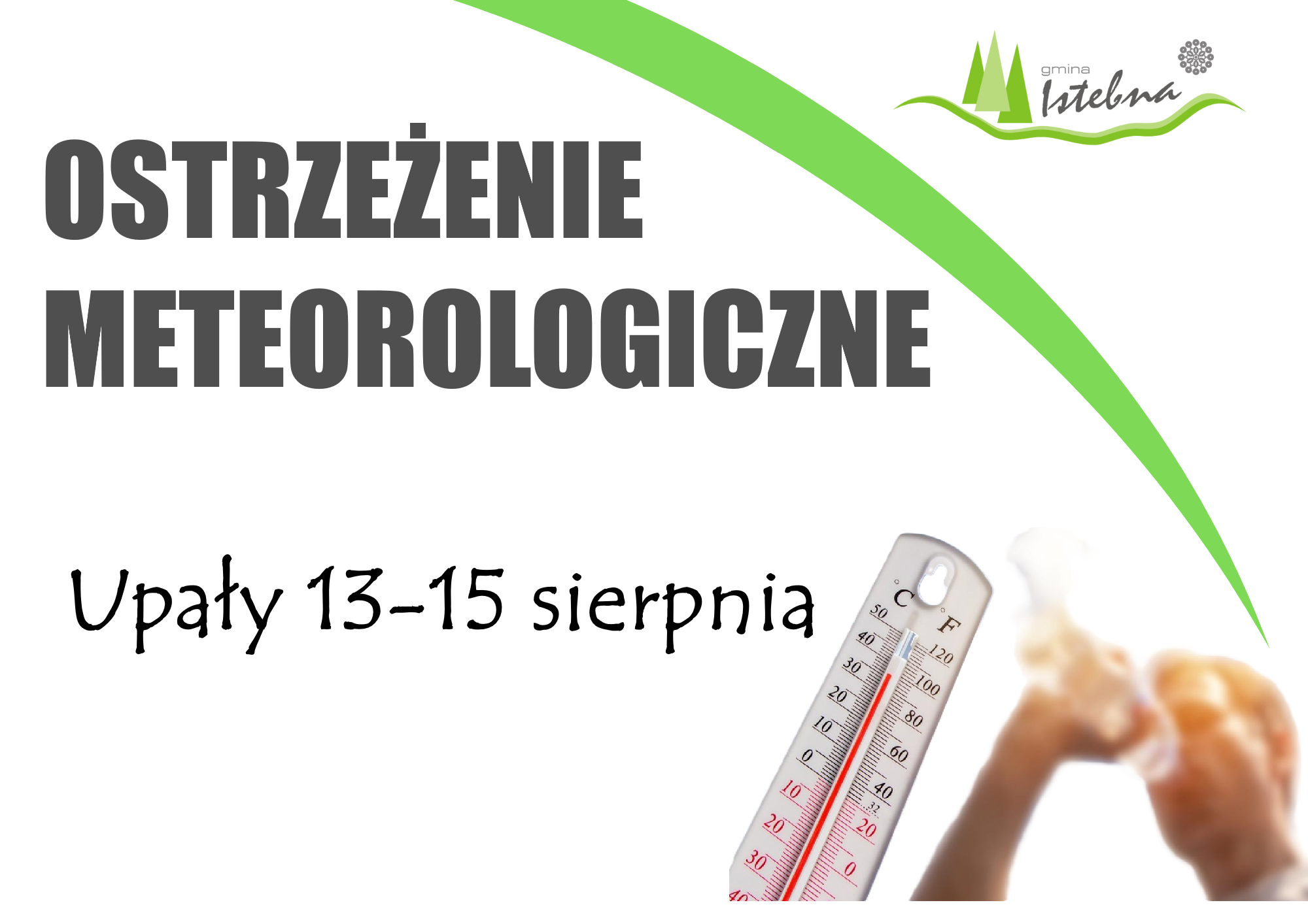 W związku z prognozowanymi na najbliższe dni upałami zwracamy się z prośbą o podjęcie niezbędnych działań mających na celu ograniczenie i minimalizację skutków występujących zagrożeń. Prognozy wskazują na fale upałów, które mogą zagrażać zdrowiu i życiu – szczególnie osobom starszym, dzieciom, osobom przewlekle chorym oraz niepełnosprawnym.