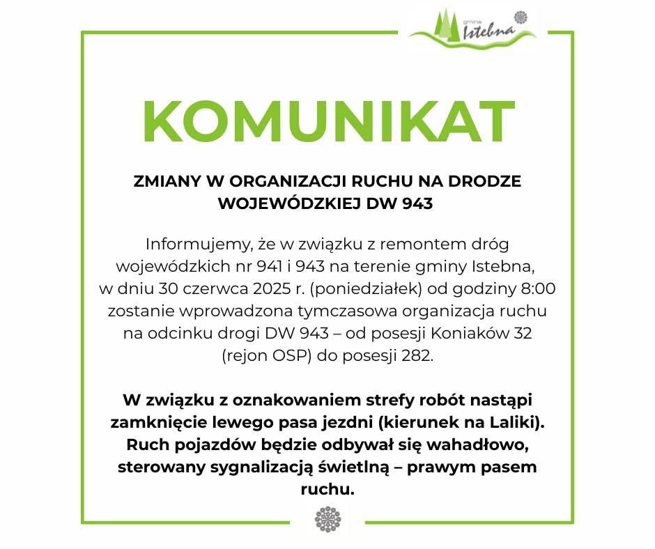 UWAGA MIESZKAŃCY! ZMIANY W ORGANIZACJI RUCHU NA DRODZE WOJEWÓDZKIEJ DW 943
